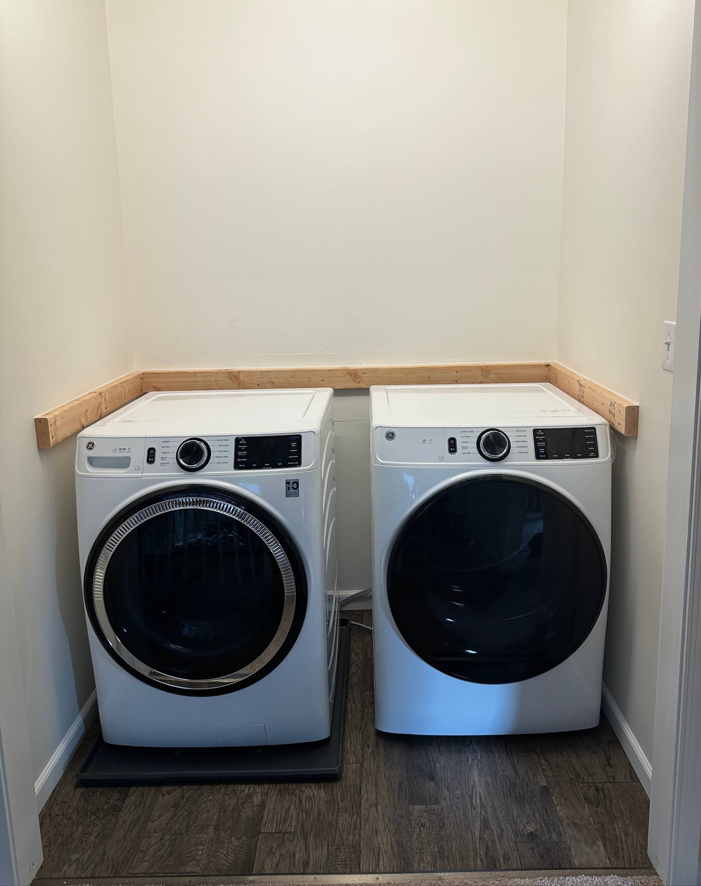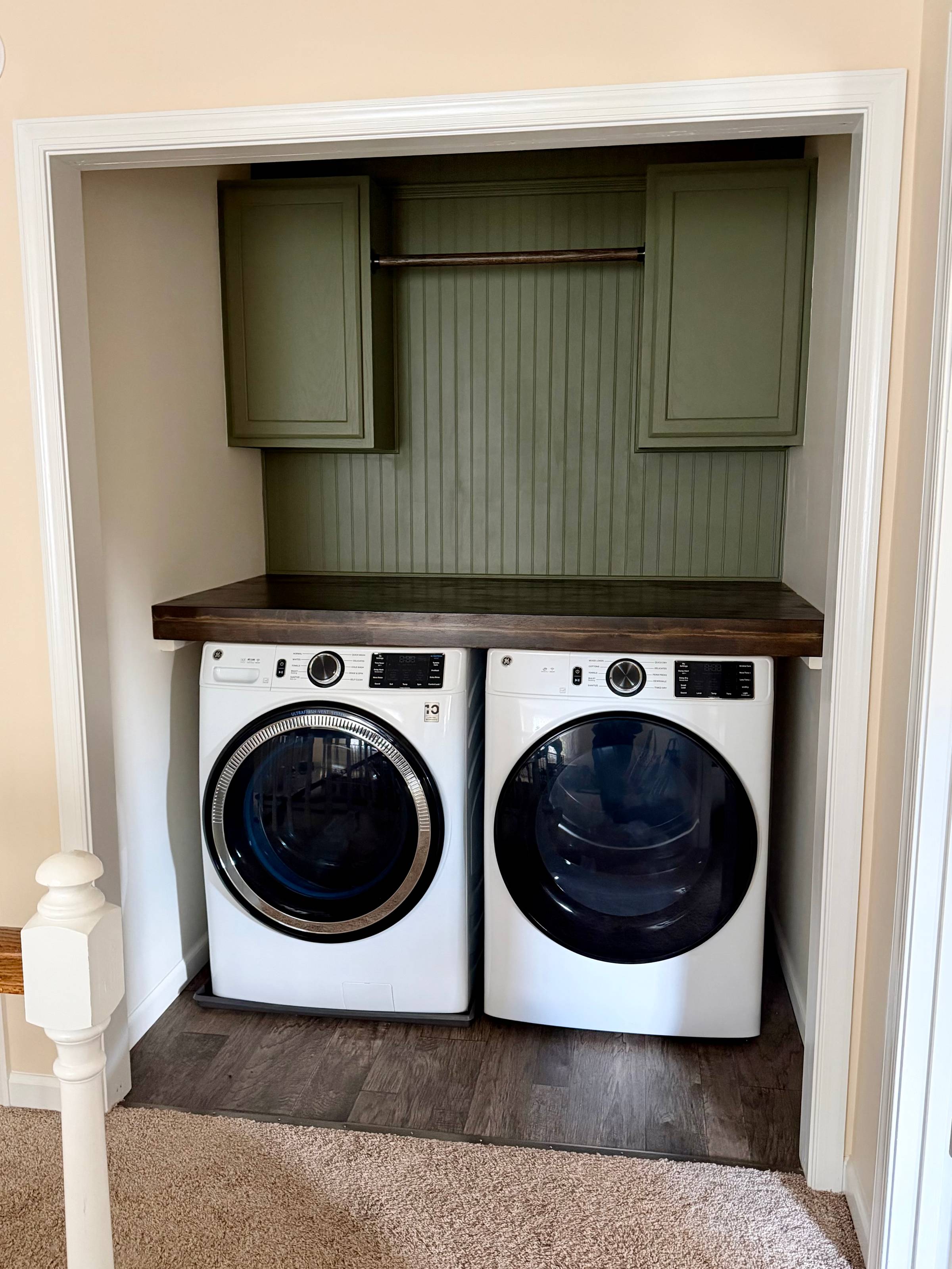 First things first, we decided on a front loading washer and dryer because we wanted a countertop to fold laundry on. We purchased from Lowe's these GE UltraFresh Front Load Washer and Dryer.