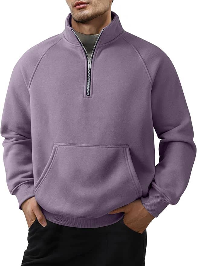 These men's sweatshirts are GOOD!!! I love the half zip, the oversize look, the comfortable material, and of course the price! These come in a variety of colors, but this muted lavendar is beautiful.
