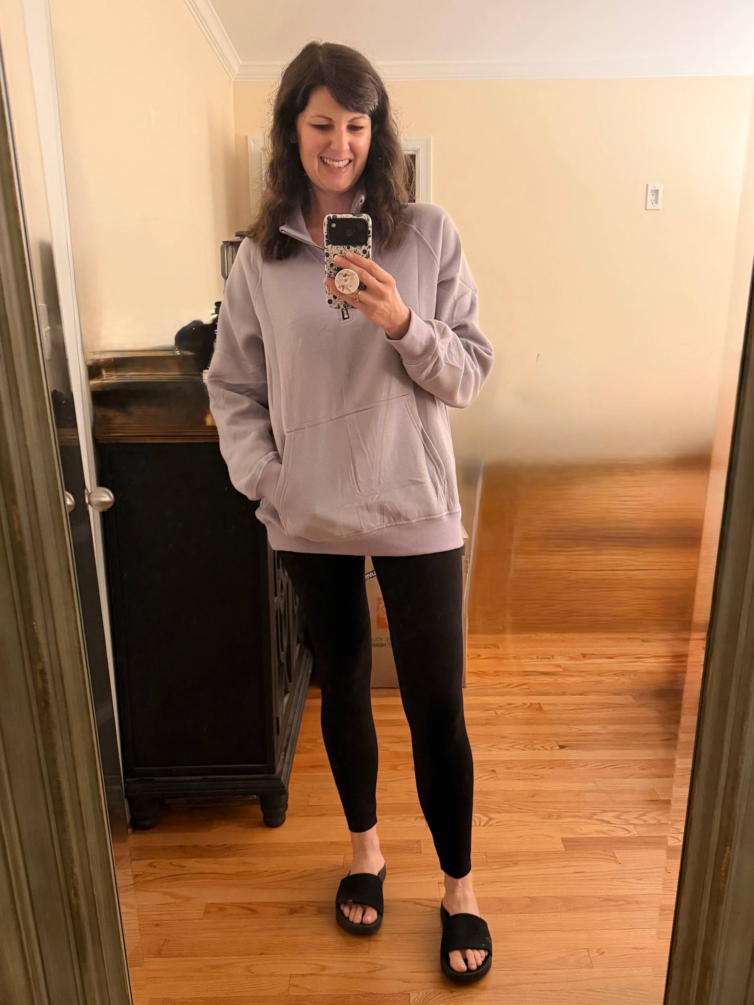 I'm always looking for a good sweatshirt that covers the bum when I wear leggings. Leggings are not my typical attire for the day, but I do love to throw them on when driving the kids to school in the mornings.